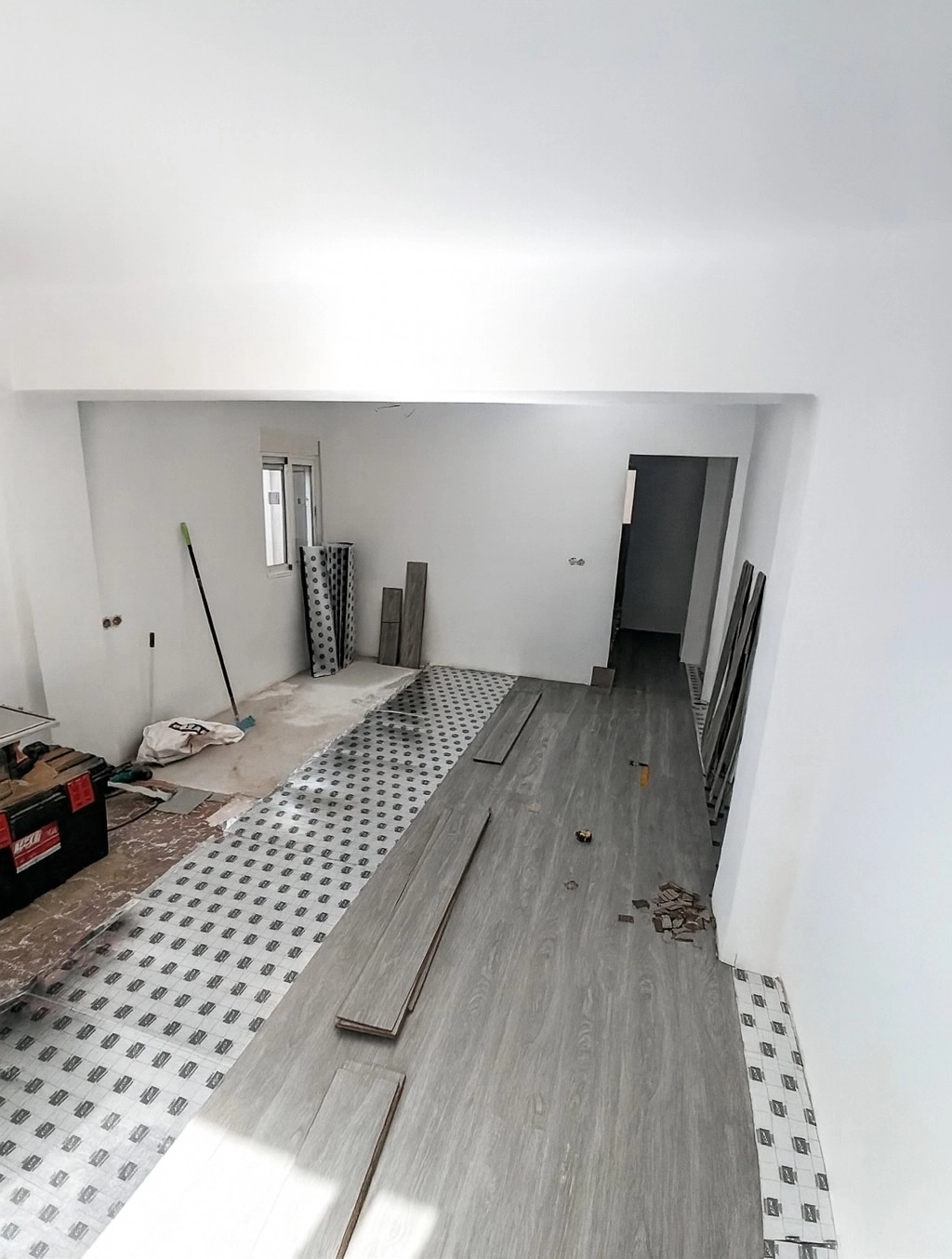 Instalación integral de suelo laminado en toda la vivienda, cuidando cada detalle para lograr un acabado limpio, uniforme y perfectamente alineado. El trabajo se ha realizado mediante sistema flotante sobre base aislante, mejorando el confort térmico y acústico, y garantizando la estabilidad del pavimento a lo largo del tiempo.
