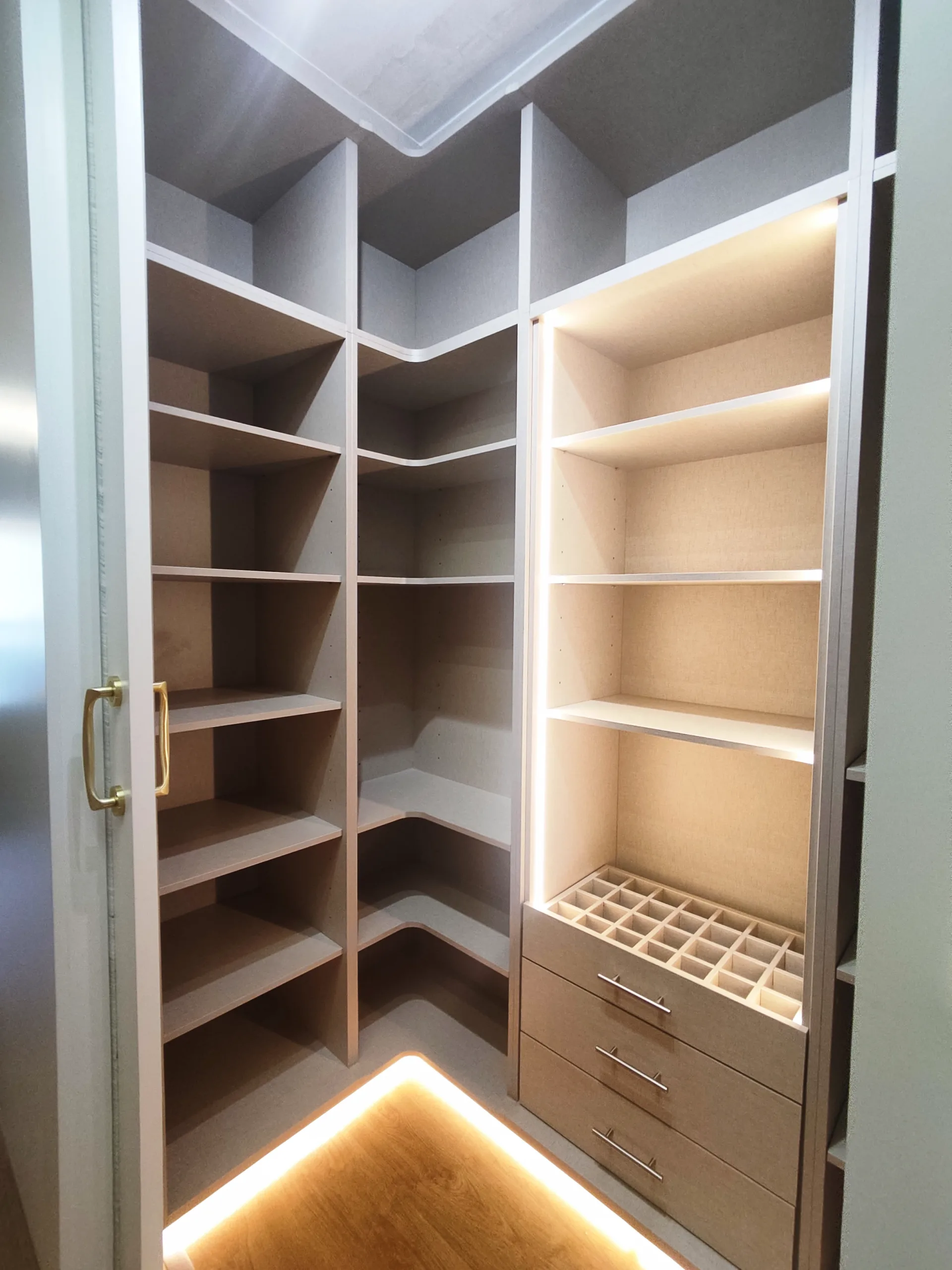 Proyecto de diseño, fabricación e instalación de vestidor totalmente a medida, concebido para transformar un espacio irregular en una zona de almacenamiento funcional, ordenada y perfectamente adaptada al uso diario. Desde el inicio, el principal reto del proyecto fue la geometría del hueco, ya que el fondo presentaba medidas muy distintas en cada tramo, lo que obligó a diseñar y fabricar cada módulo con dimensiones específicas para encajar con precisión.